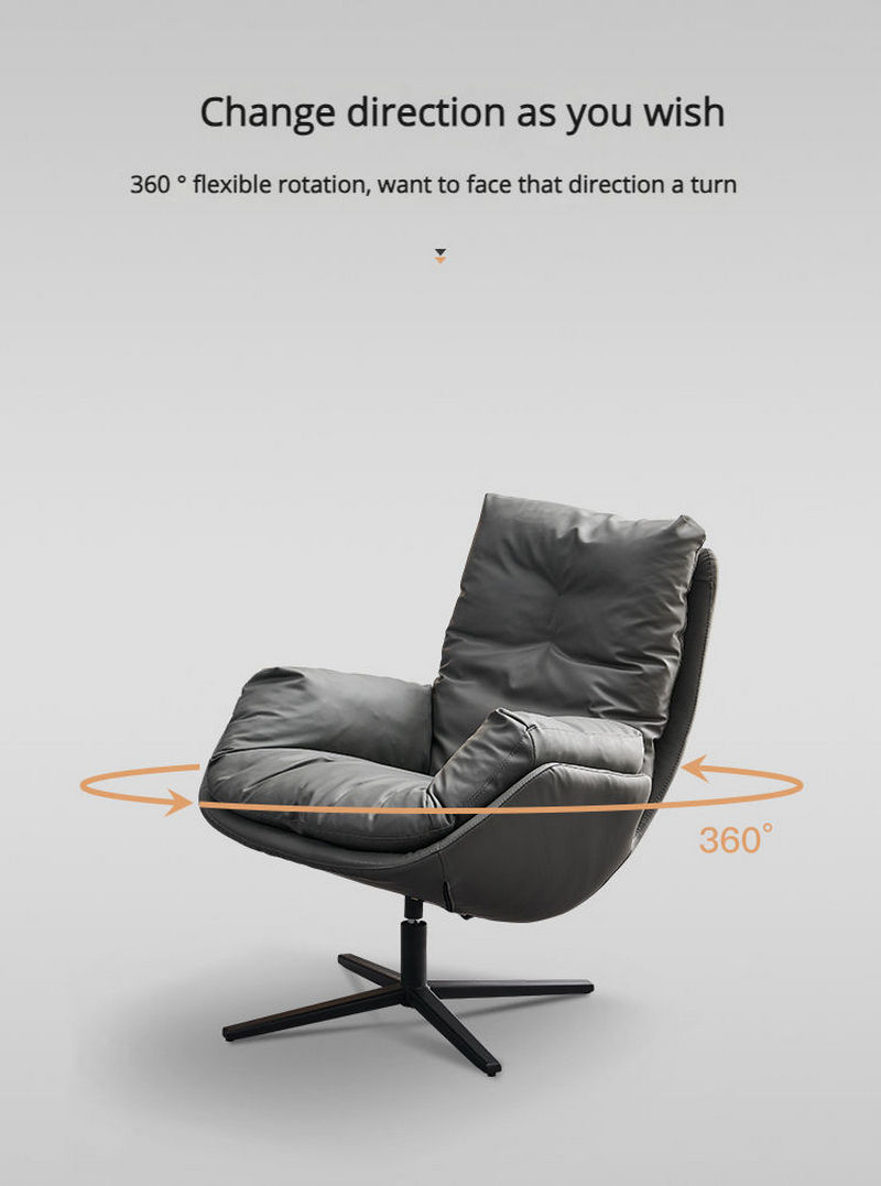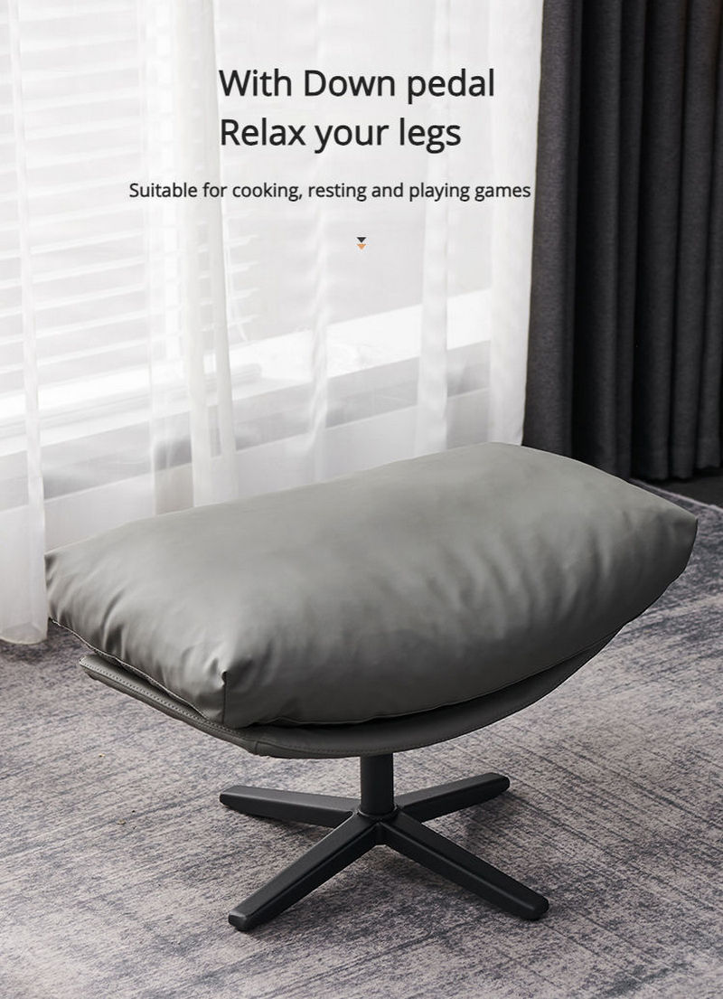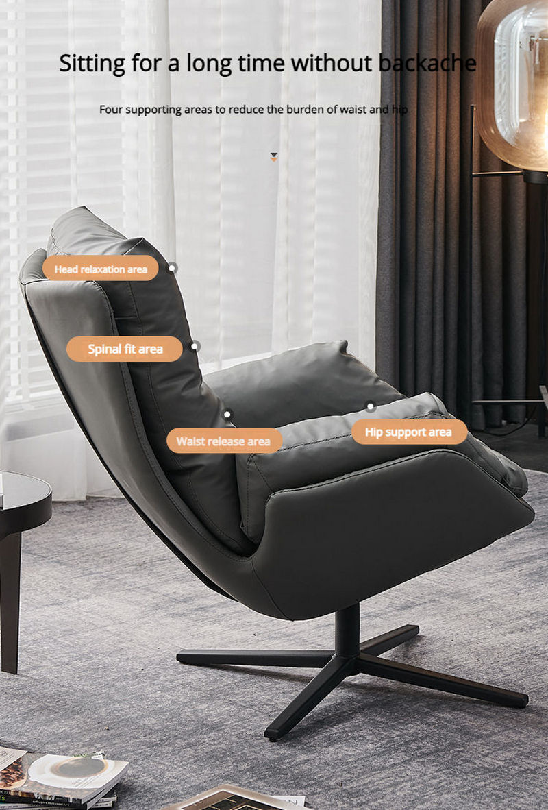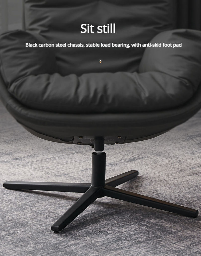Constructed with a durable curved panel frame, plush down cushion, high-quality silicone leather upholstery, and a sturdy 4-star black metal base, this chair delivers exceptional comfort and long-lasting durability. Its ergonomic 4-zone support design (head, spine, waist, hip) ensures all-day comfort without backache, while the 360° flexible rotation and matching down-filled ottoman offer ultimate relaxation for living rooms, offices, and commercial spaces.