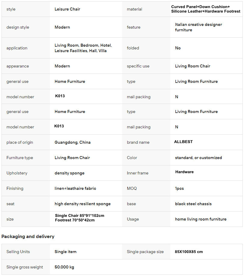 Material:Curved Panel+Down Cushion+Silicone Leather+Hardware Footrest
